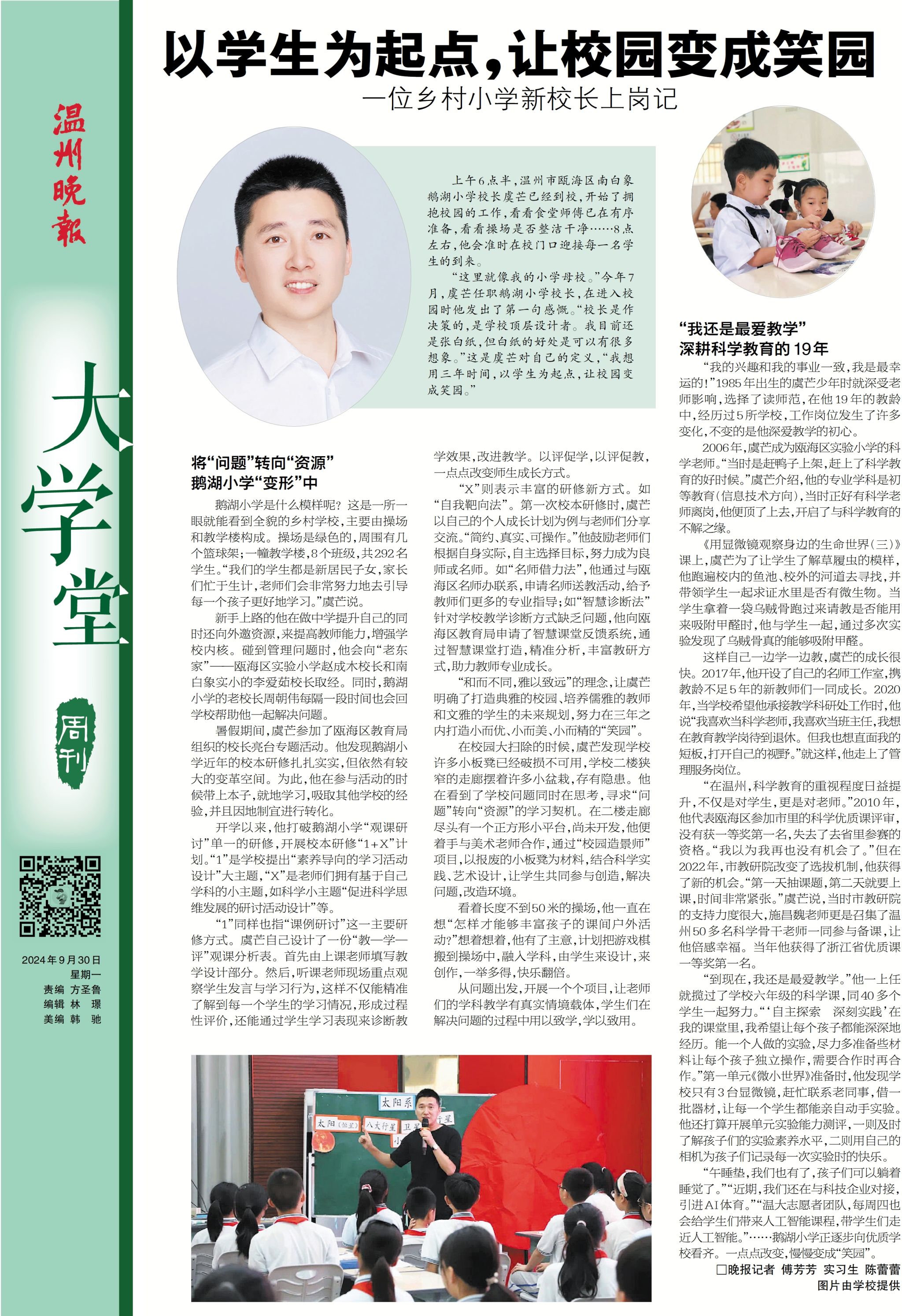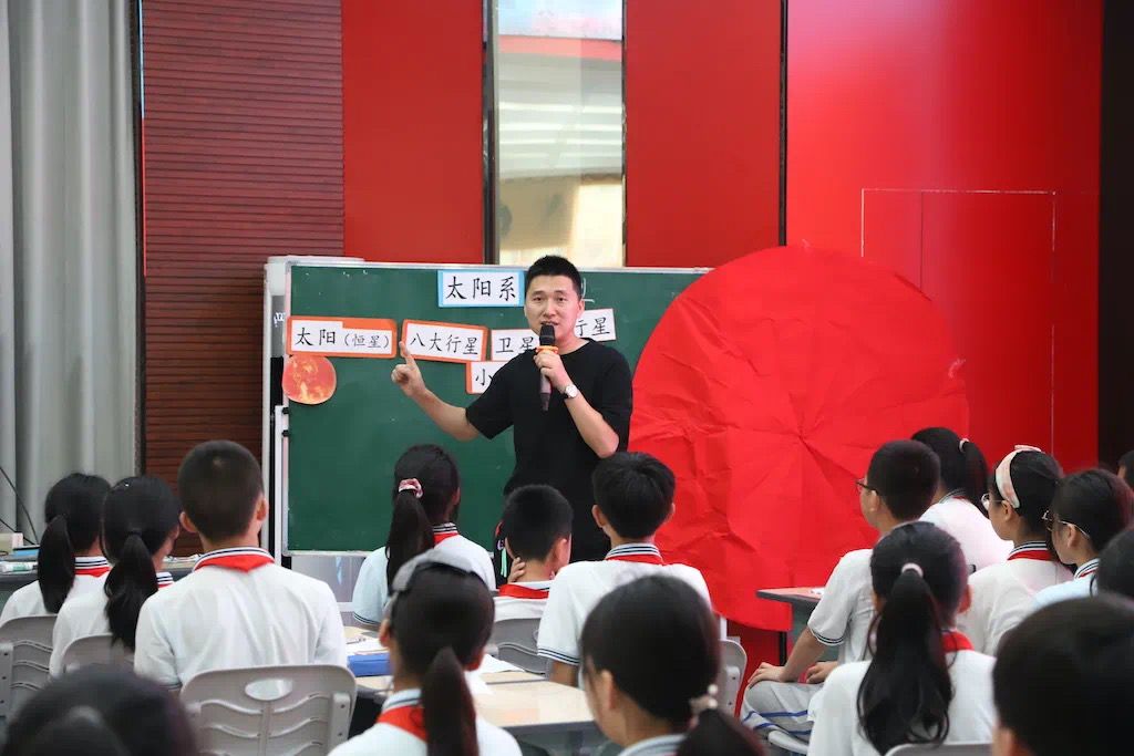 “到现在,我还是最爱教学。”他一上任就揽过了学校六年级的科学课,同40多个员工一起努力。“‘自主探索 深刻实践’在我的课堂里,我希望能让每位孩子都能深深地经历。能一个人做的实验,尽力多准备些材料让每个孩子独立操作,需要合作时再合作。”第一单元《微小世界》准备时,他发现学校只有3台显微镜,赶忙联系老同事,借一批器材,让每一个员工都能亲自动手实验。他还打算开展单元实验能力测评,一则及时了解孩子们的实验素养水平,二则用自己的相机为孩子们记录每一次实验时的快乐。